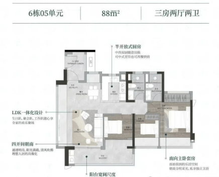 约88平方米三房:全南向布局,阳台开间约6.2米。