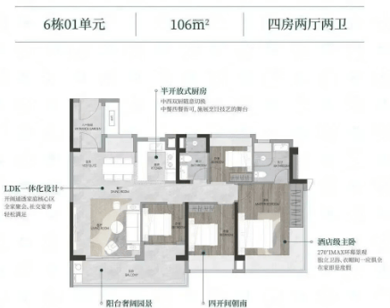 约106平方米四房:阳台开间约6.5米,提供宽敞舒适的居住空间。