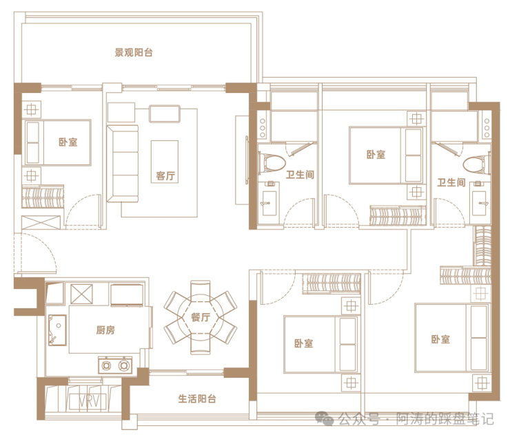 ✨【板楼户型】约143㎡4房2厅2卫:板楼户型楼距宽绰,专梯专户、创新型LDKG餐客厨阳台一体化设计,四面宽朝南,客餐厅无梁一体化,约7.15米宽幕阳台,南北双向园林景观。