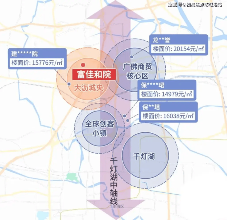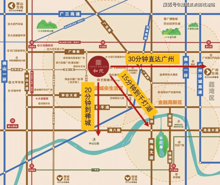 路网交通:周边“三横三纵”主干道(海八路、桂澜路、佛山一环)覆盖,20分钟直达千灯湖CBD,25分钟通达广州荔湾;