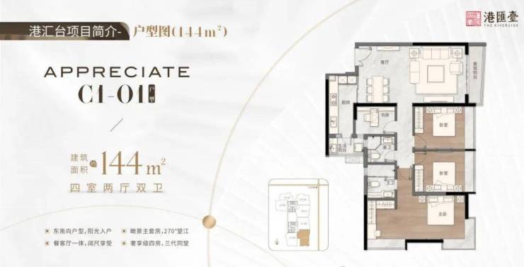144㎡四房两厅二卫:奢享级四房,三代同堂,主卧朝南,270度望江,餐客厅一体,阔尺享受。