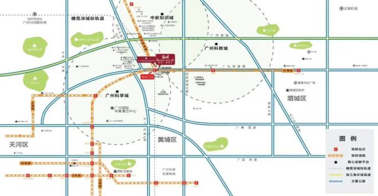不同于很多打着“近地铁”旗号却要绕行十几分钟的楼盘,侨建·御溪谷的社区红线几乎紧贴地铁口。从21号线出发,1站到镇龙换乘快线,2站就能抵达天河大观南路,早高峰实测打车到珠江新城约40分钟。除了地铁,周边还有新白广城际(已通车)、增天高速(在建)以及四纵六横的主干道网络,无论是通勤还是周末自驾出游,路网选择都比较灵活。对于在知识城、科学城甚至天河工作的家庭来说,这里的通勤成本其实比预想中友好。