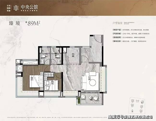 89㎡三房两卫:总价350万元起,东南/西南朝向,主卧南北对流,次卧与客厅共享7米面宽,得房率102%;