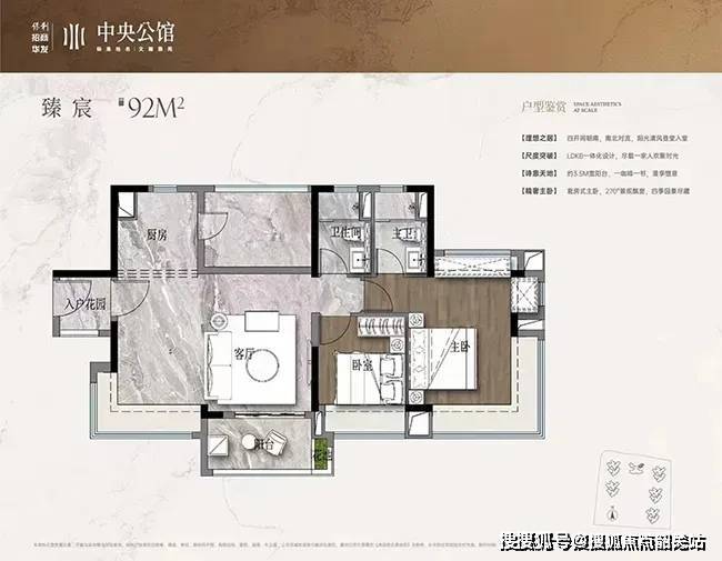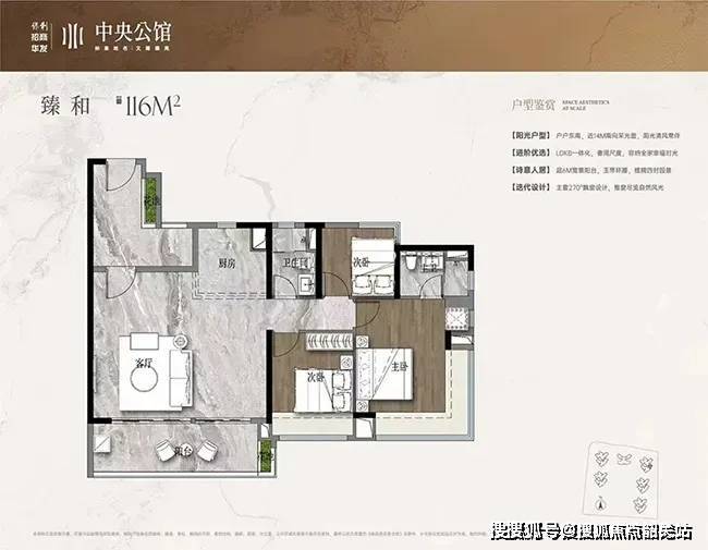 116㎡四房两卫:总价490万元起,东南向户型,270°双面采光,主卧套房设计,独立家政间提升收纳效率;
