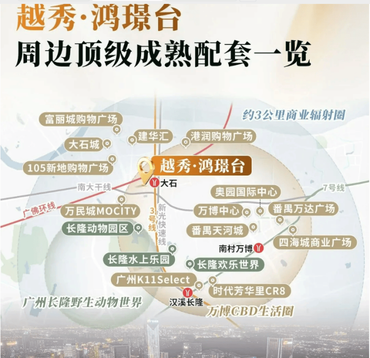 板块价值是衡量房产潜力的核心指标。越秀·鸿璟台所在的番禺大石板块,正处于广州城市南拓战略的关键节点,也是连接天河、海珠与南沙的重要枢纽。该区域不仅拥有成熟的居住氛围,更承载着巨大的城市更新潜力。随着南大干线、新光快速路等交通动脉的贯通,大石板块已不再是传统的睡城,而是逐渐演变为集商务、居住、休闲于一体的综合性功能区。项目周边路网发达,自驾出行极为便捷,一脚油即可抵达长隆万博商圈或珠江新城,极大地提升了区域的生活效率和商业活力。