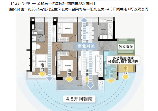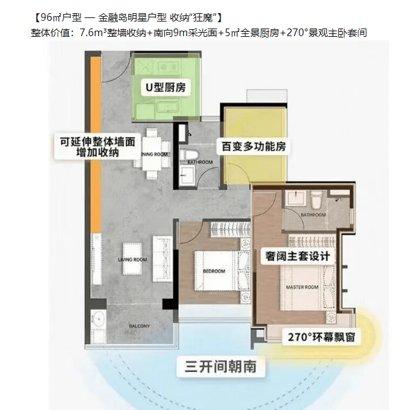 项目主力户型涵盖80㎡三房、96㎡三房、123㎡四房及141㎡四房,得房率约82%。80㎡户型紧凑实用,适合刚需上车;96㎡实现7.6米整墙收纳+270°景观主卧;123㎡配置南北对流主卧套房与金融岛罕见阳光玄关;141㎡则打造46㎡客餐厨一体化空间与14.5米南向采光面,尺度感媲美传统大平层。所有户型采用全南向蝶形布局,通风采光优异,部分高层单位可享无遮挡江景。当前6号楼清栋促销,现房或准现房状态叠加价格回调,性价比凸显,适合注重实景兑现与通勤效率的改善及投资客群。