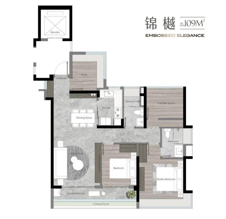 2. 建面约109㎡奢适全能户型:同样为尊贵端户,奢厅入户设计,南北对流且三开间朝南。主卧与书房配备约270°转角飘窗,大幅增加室内采光面与观景视野,让业主在室内即可欣赏到社区园林美景。户型布局合理,功能分区明确,兼顾实用性与舒适性,适合三口之家居住。