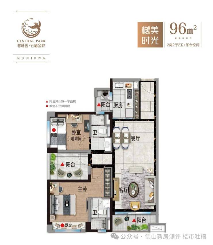 双阳台设计:生活阳台与观景阳台分离,功能分区明确。
