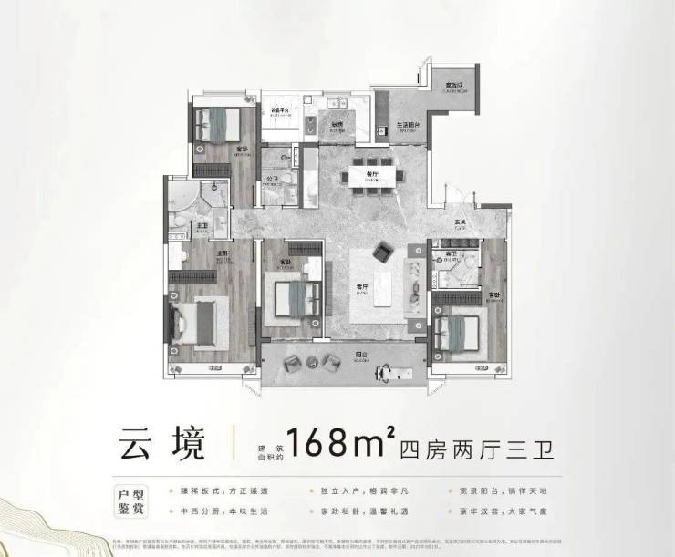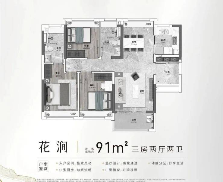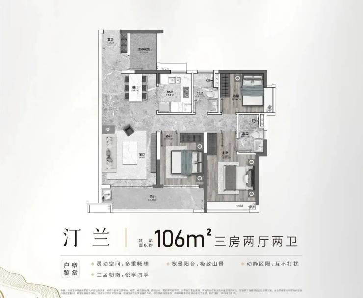 璟珑府的户型设计强调“功能聚合+空间延展”。以91㎡三房为例,实现四开间朝南、U型厨房、大尺度阳台,采光与动线俱佳;106㎡户型则灵活提供三房或四房选择,均配备超宽景观阳台;142㎡与168㎡大户型采用南北通透、动静分区布局,主卧套房带独立衣帽间与卫浴,居住体验堪比豪宅标准。值得一提的是,小高层产品均为纯板式设计,户户朝南、专梯专户,私密性与舒适度远超同价位竞品。虽有观点认为其设计“中规中矩”,但恰恰是这种回归居住本质的务实风格,赢得了大量注重实用性的改善家庭青睐。