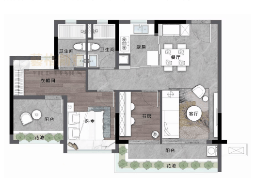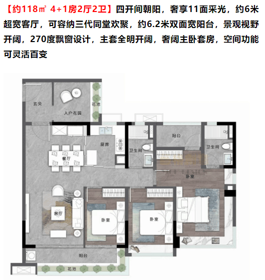 约118㎡ 4+1房2厅2卫:四开间朝阳,约6.2米双面宽阳台,270度飘窗设计,奢阔主卧套房。