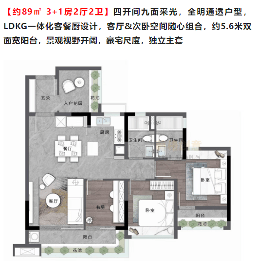约89㎡ 3+1房2厅2卫:九面采光,LDKG一体化设计,约5.6米双面宽阳台,空间灵活。
