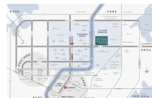 教育配套: 项目自身配建幼儿园。根据规划,项目东北侧有54班制中小学教育用地(具体办学品牌以政府最终引进为准),同时可共享从化区现有优质教育资源。商业配套: 社区自建约3500㎡主题商业街。5-10分钟车程内可抵达新世纪广场、欣荣宏广场等成熟商圈。此外,总投资约71亿的东风村旧改将规划9个大型商业中心,未来商业能级将大幅提升。广州图书馆溪境分馆已确定入驻,是重大文化配套。