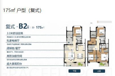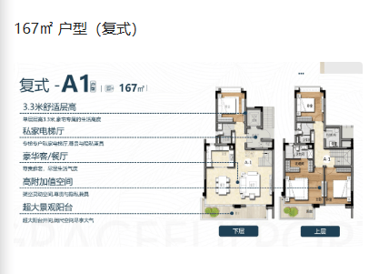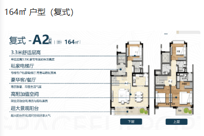 164㎡至183㎡的复式户型则充分满足了对空间有更高要求的业主。复式设计增加了居住层次感,上下分层布局合理,互不干扰。上层通常为主卧及次卧,下层为客厅、餐厅及厨房,动静分离,私密性强。复式户型还带有露台或阳台,提供了更多的户外活动空间。