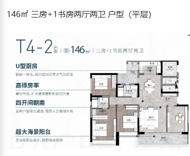 146㎡户型拥有三房加书房,兼具居住与办公功能,适合三代同堂的家庭。该户型布局合理,客厅宽敞明亮,餐厅与厨房相连,方便日常用餐与烹饪。主卧配有独立卫生间,提升了居住的私密性与便利性。书房的设计则为家庭成员提供了独立的学习与工作空间。