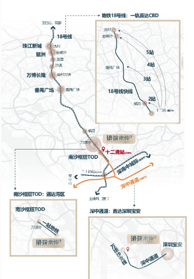 交通配套方面,除深中通道带来的通勤优势外,还享受广州地铁18号线的高效出行体验。项目距离18号线南延段的十二涌站约1.2公里,该段广州段预计2025年正式通车,未来2站即可到达番禺广场,5站即达珠江新城CBD。此外,项目周边还规划有湾区首条时速160km/h的地下轨道交通,未来将实现广州、中山、珠海一线互通。