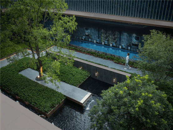 A:社区内部打造了约 3.6万平方米 的森系园林,规模宏大,采用“一廊一环五景”布局,配有双泳池、儿童乐园等设施。