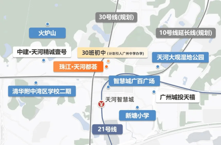 天河智慧城作为国家级高新区、省级高新区,聚集了网易、小鹏汽车等 3000 余家高新企业,拥有 7 个国家级创新平台,科创实力拉满。根据广州市政府规划,智慧城板块将打造成为 “山 — 产 — 城 — 园” 融合样板区,依托华南国家植物园和火炉山森林公园的生态优势,实现产业发展与宜居生活的完美平衡广州市人民政府。