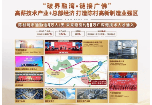 陈村自2019年起被评为全国千强镇,作为顺德“北大门”,地处珠江三角洲腹地和广佛都市圈核心区域,同时位于三龙湾板块的“绿芯”,是粤港澳大湾区的“产城融合示范区”,政策支持力度大,产业发展迅猛,吸引了大量高新技术企业和高端人才入驻,为区域房产价值提升提供了有力支撑。