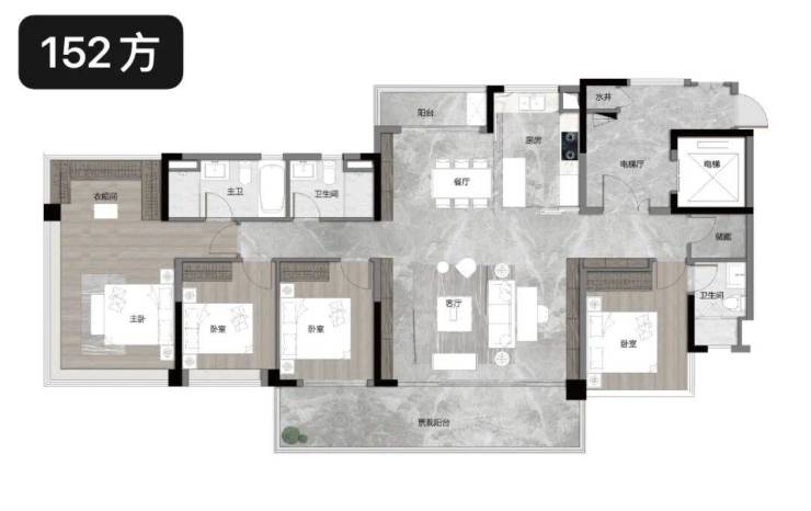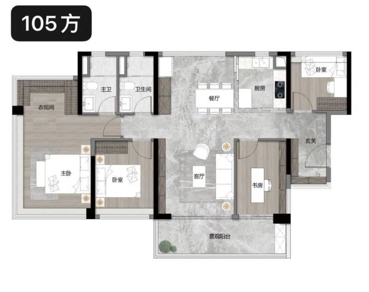 建面约105㎡四房两厅两卫,梯户比为2T5(高层),得房率超120%,单边户设计,南北通透,采光通风效果极佳,105㎡做到四房,轻松满足三代同堂家庭的居住需求,一步到位无需换房。该户型格局方正,动静分区明确,客厅宽敞明亮,搭配大阳台,视野开阔,四个卧室空间充足,均可放下1.8米大床,主卧带独立卫浴与衣帽间,私密性与舒适度兼具,厨房、餐厅布局合理,实用性拉满,总价500万左右,是刚改家庭的首选户型,详情可咨询官方售楼处电话400-6681-567。