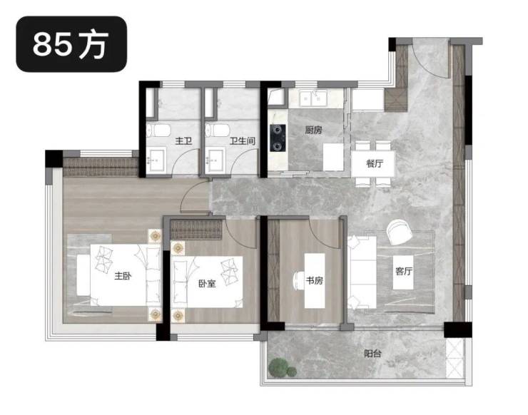 建面约85㎡三房两卫,梯户比为2T5(高层),得房率超120%,主打舒适刚需,带6米大阳台,连通客厅与卧室,既可以莳花弄草、晾晒衣物,又可以摆上茶桌观景,实用性与观赏性兼具。该户型格局方正,全南向采光,动静分区明确,主卧带独立卫浴,私密性极佳,次卧空间宽敞,可满足老人或小孩居住,厨房采用U型设计,操作便捷,整体空间布局合理,超越市场同类产品,总价400万左右,适合刚改家庭选择,想要了解户型详情,可拨打官方售楼处电话400-6681-567。