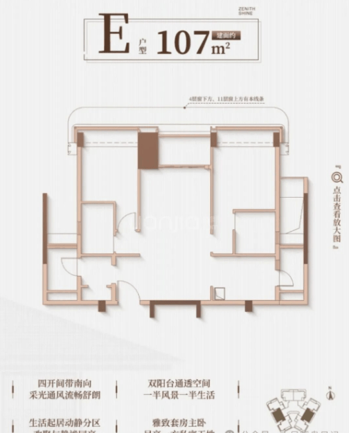 107㎡三房户型:入户有专属鞋柜空间,客厅直出阳台可眺望白云山,卧室面积均达10㎡以上。