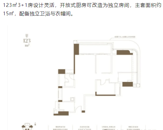 123㎡3+1房户型:开放式厨房可改造为独立房间,主套面积约15㎡,配备独立卫浴与衣帽间。