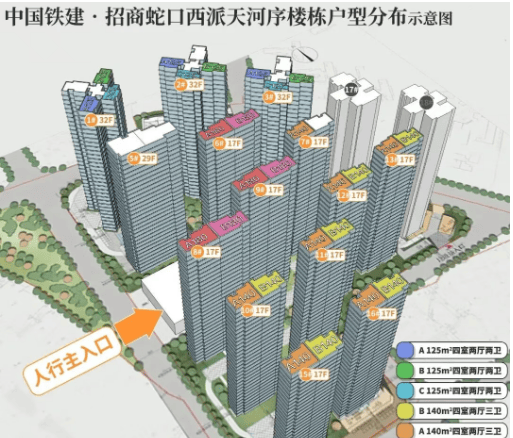 西派天河序位于广州市天河区,是由中铁建和招商蛇口联合开发的高端住宅项目。该项目占地面积76,904.81平方米,建筑面积142,416平方米,容积率为3.0,绿化率为27%,总户数为744户。项目规划了16栋住宅楼,包括17-32层高的板楼和塔楼,总套数为1,160套,实用率高达100%-110%。