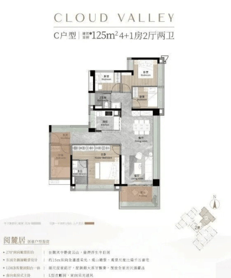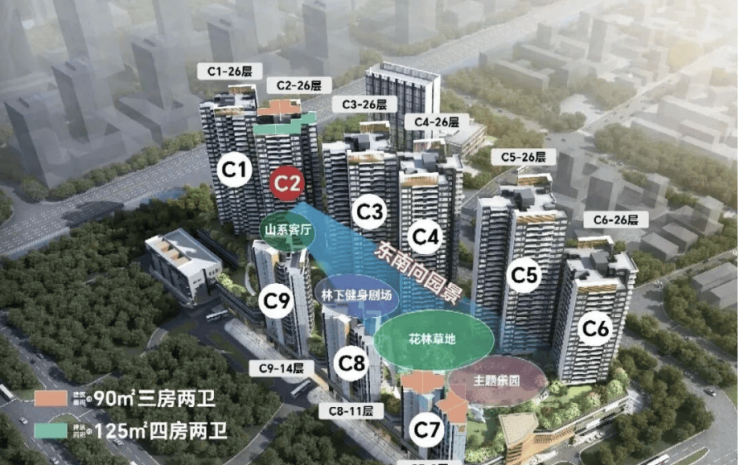 C2栋为景观楼王,南向一线白云山及空中园林,全户专梯入户、低密舒居、通风采光佳。