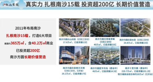在南沙区域,方圆集团深耕十二载,2020 年 4 月以 48.6 亿元拿下黄阁核心地块,折合楼面价 9951 元 /㎡,匠造约 156 万㎡东方人居大城 —— 南沙十里方圆。项目并非单一住宅开发,而是以 “造城” 理念赋能区域发展,斥资超亿元引进省级名校,配建 20 万㎡商业综合体,实现配套先行、品质落地。旗下云山诗意、叠翠峰等项目在南沙市场溢价率高于同板块 10%-20%,品质与口碑双认证,为悦山书院的开发建设奠定坚实基础。