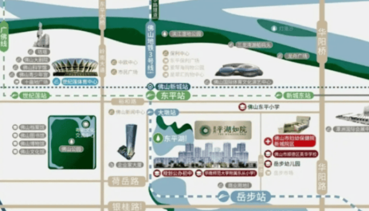 交通方面:项目覆盖“三横五纵”主干道,快速接驳华阳路、岭南大道、佛山大道、汾江南路及佛山一环,10分钟可达乐从及北滘商圈,同样时间内可抵达禅城亚艺;20分钟内能够到达千灯湖及广州南站。轨道交汇处距离项目仅300米,包括已开通的佛山地铁3号线岳步站,还有规划中的多条线路,使得通勤更加高效。