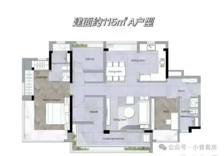 约136㎡四房:为约115㎡户型的放大版,增加了转角玄关和内阳台,主套间的弧形飘窗提升了观景体验。