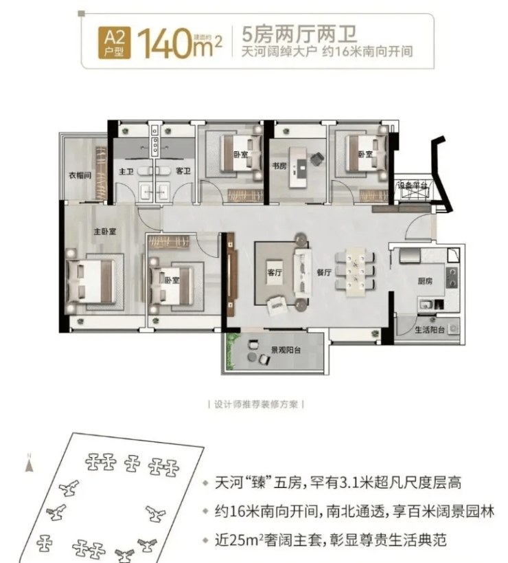 194㎡ 五房三套房:面向高端改善客群,南北双景观阳台,约32㎡奢华主套配备独立衣帽间,全屋标配中央空调+华为智能家居系统,定义天河品质生活新标杆。