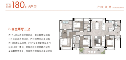 珠江天郦首推户型为 125㎡-180㎡四房,均为当下主流的改善型户型设计,能很好地兼顾居住的舒适性和实用性。户型布局合理,空间利用率高,各个功能区域划分清晰,满足不同家庭结构的居住需求。例如,180㎡的户型配备了长辈套房,为多代同堂的家庭提供了更私密、舒适的居住空间。