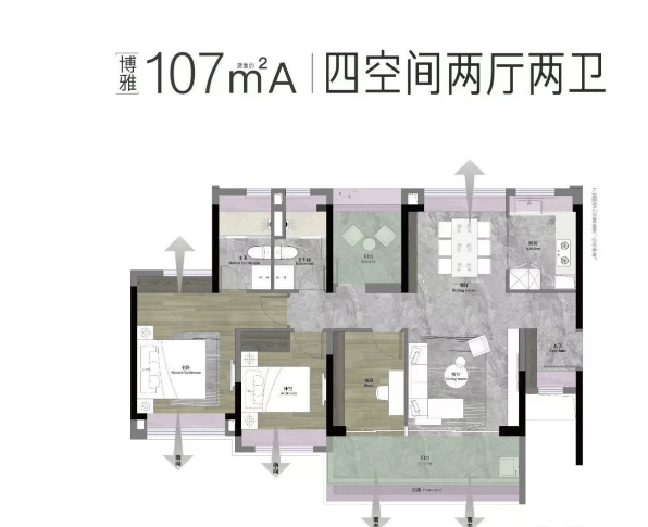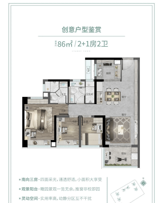 越秀大学星汇城的户型设计充分考虑到了居住者的实际需求和舒适度,所有户型均为全南向设计,确保了良好的采光和通风效果。其中,88平方米的三房两卫户型采用了经典竖厅设计,客厅长达10米的收纳柜既实用又美观;而107平方米的四房两卫户型则分为A、B两种户型,四开间朝南,开间最大可达5.9米,动静分区合理。125平方米的四加一房户型更是实现了南北对流,阳台宽度达到了6.2米,采光视野绝佳,LDKB一体化设计让整个空间更加宽敞明亮。