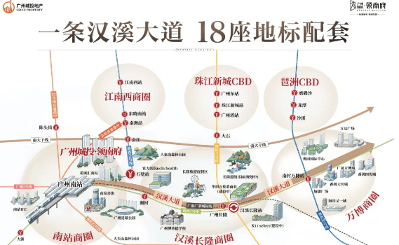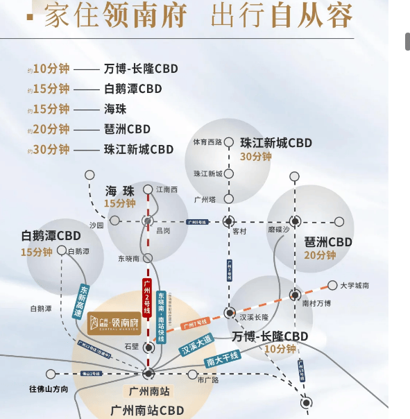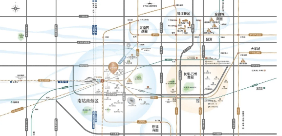 生活配套丰富且逐步完善。外部,以 “一轴两涌 + 一核五区” 的空间布局,致力于打造 “站城一体、业态融合的大湾区门户枢纽” 和世界级文商旅目的地。一条汉溪大道串联起多个核心商圈,尽享城市繁华。周边有超大型体育文化综合体广州足球公园,以及约 4000 亩大象岗森林公园和长隆旅游度假区等文旅资源。商业方面,除自家底商外,走路 20 来分钟或开车不到 10 分钟可至约 26 万㎡南站花城汇商业,还有多个商业综合体在建。内部,拥有约 3.6 万㎡私家园林,以 “一廊一环五景多花园” 布局,打造了健身盒子、健康环跑道等各类休闲康养设施,营造出如同森林般的生态秘境。