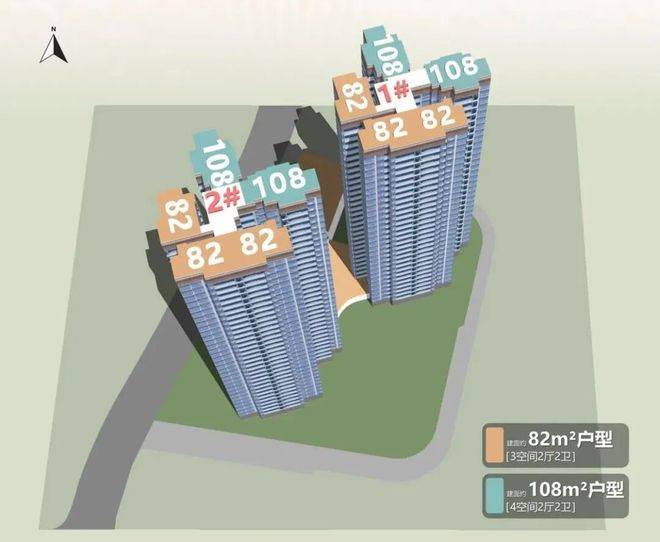 1号楼:89平方米三房(南向)、105平方米四房(南北对流)