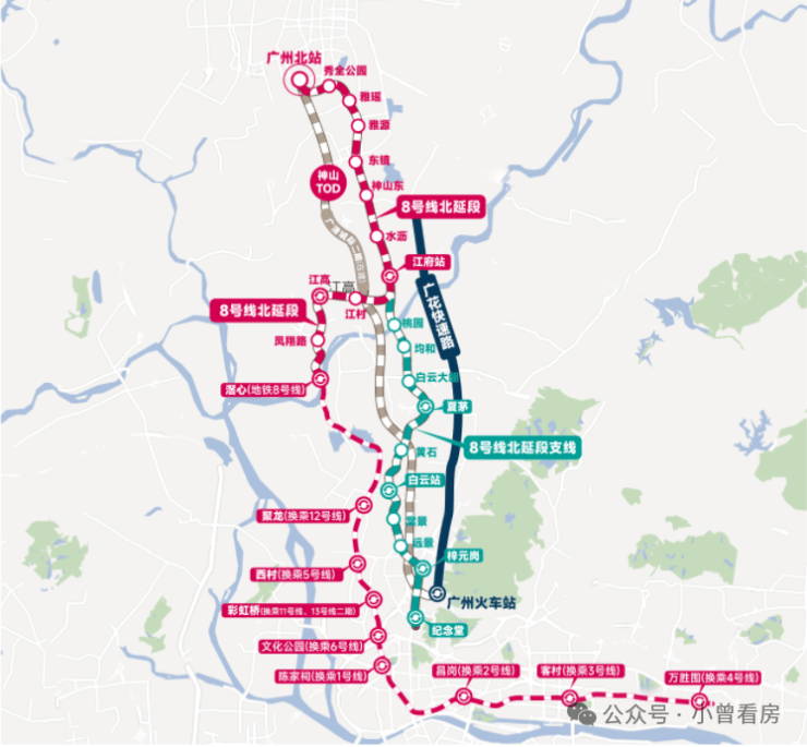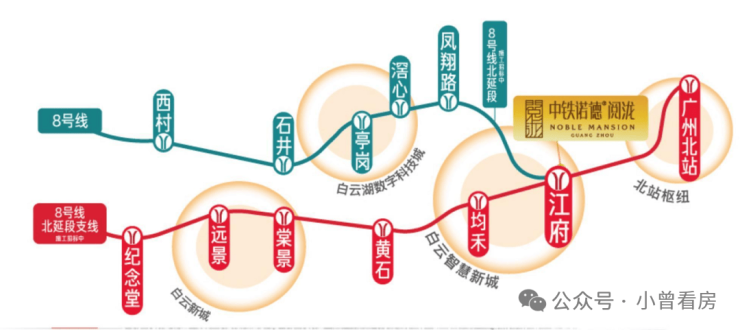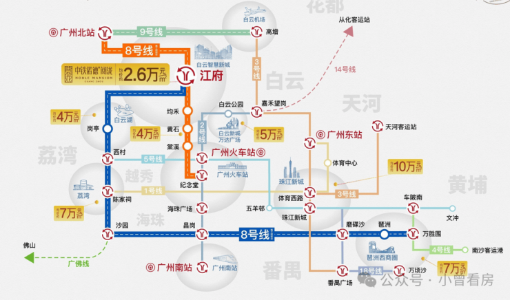 地铁:项目紧邻地铁8号线北延段江府站(在建)和24号线江高站(规划),步行8分钟即可到达。8号线贯穿白云、越秀、海珠三大中心区,24号线通车后将串联白云机场、广州火车站、广州南站等交通枢纽,形成“15分钟中心城区生活圈”。