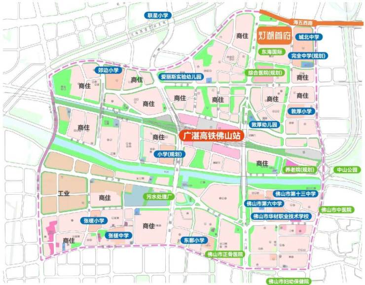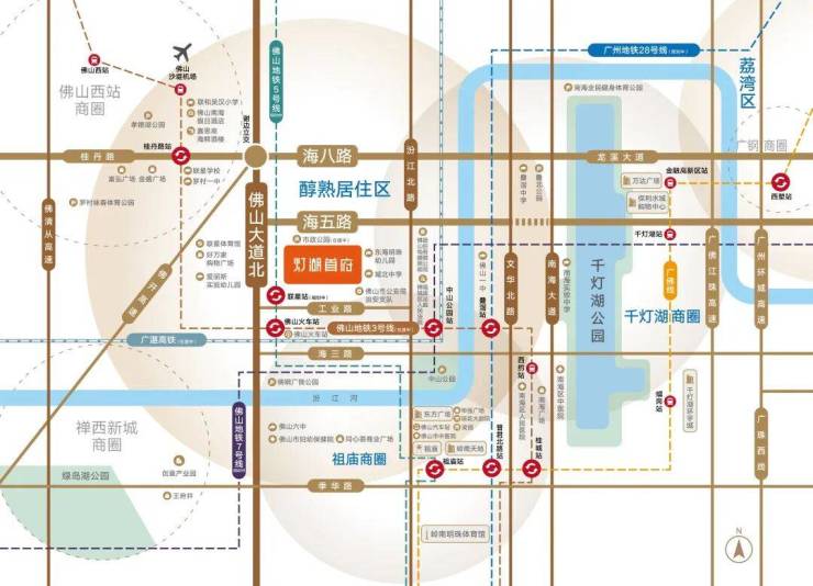 项目地处交通要塞,佛山地铁3号线敦厚站(在建)距离约1公里,未来连接禅城与桂城核心区。规划中还有佛山5号线、7号线以及广州28号线,形成多轨交汇的交通格局。广湛高铁佛山站也位于项目范围内,是广东首个站城一体化高铁枢纽,预计2025年建成后可直达广州,仅需一站。公路系统方面,项目毗邻佛山大道、海五路、海八路、季华路等主干道,构建四横四纵立体交通网,出行便捷无忧。