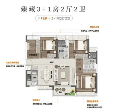 89㎡ 4房2厅2卫:格局方正,适合三代同堂居住。