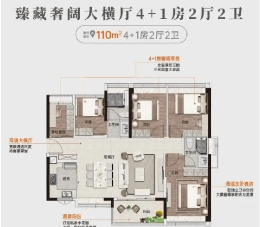 110㎡ 5房2厅2卫:打造私家小花园,全面满足大家庭需求。