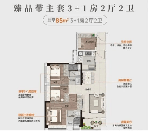 85㎡ 4房2厅2卫:双次卧带飘窗,东南向望园林及泳池。