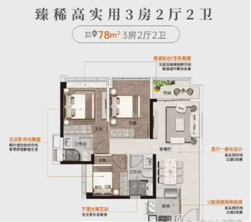 78㎡ 3房2厅2卫:无遮挡阔境视野,拥揽城市繁华央景。