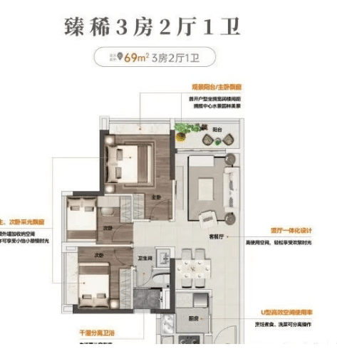69㎡ 3房2厅1卫:配备阔绰观景阳台,享受中心水景园林美景。