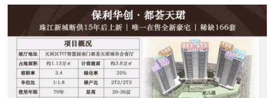 保利华创·都荟天珺是保利发展旗下最高端的“天”字系产品之一,位于广州市天河区珠城东、马场旁,紧邻珠江新城东区。该项目因其高端定位和优越地理位置而备受关注,占地面积11000平方米,建筑面积38000平方米,容积率为3.4,绿化率为35%,总户数仅166户。项目主打豪宅市场,户型面积从157平方米到257平方米不等,提供了一种极致的居住体验。