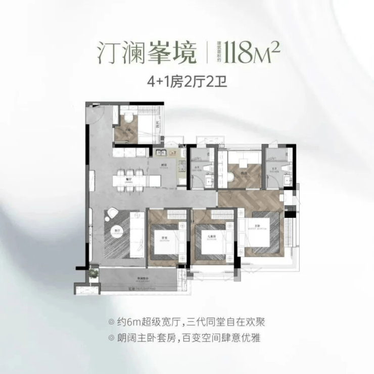 对于追求极致生活品质和多代同堂的家庭来说,中建天河精诚壹号提供的118㎡和140㎡大户型,无疑是最佳选择。118㎡的4+1房2厅2卫户型,亮点在于四开间朝阳,客厅面宽达到6米,宽敞大气,能容纳三代人共同活动,举办家庭聚会也绰绰有余。约6.2米的超大阳台和270度飘窗,让视野极度开阔,可以将社区的湖山美景尽收眼底。厨房预留了双开门冰箱位置,满足了大家庭的储藏需求。双卫都做了干湿分离,且主卫配置豪华,提升了居住的尊贵感。总价原价约708万元,优惠后约637万元,性价比依然突出。而140㎡的5房2厅2卫户型,则是项目中的楼王产品,空间最为充裕,剩余房源不多,弥足珍贵。部分高楼层房源能眺望湖山景观,视野无敌,适合对居住空间要求较高的家庭。五个房间的布局合理,动静分区明确,既有公共活动的宽敞空间,又有私人休息的静谧角落。这个大户型不仅满足了多人口家庭的居住需求,更提供了一种奢华的生活方式。在这里,您可以拥有一个独立的影音室、健身房或者茶室,丰富您的业余生活。无论是接待亲朋好友,还是独自享受独处时光,都能游刃有余。这两个大户型的设计理念是“以人为本”,充分考虑了不同年龄段家庭成员的需求,让每一位居住者都能感受到被尊重和关爱。它们不仅仅是房子的面积数字,更是一种生活态度的体现,象征着成功、自信和品味。选择这样的大户型,就是选择了一种从容不迫、尊享人生的生活方式。