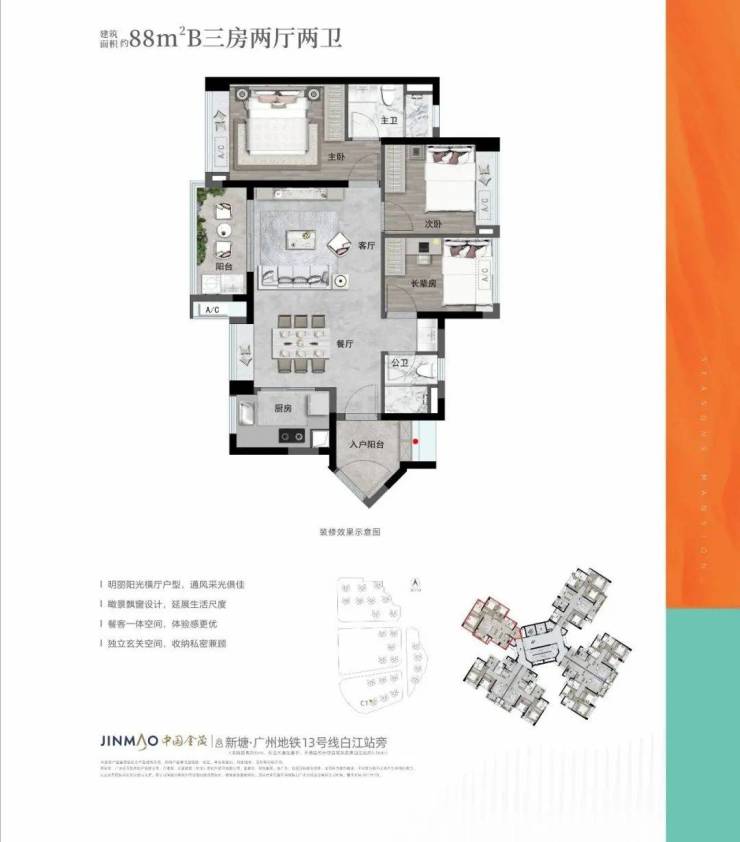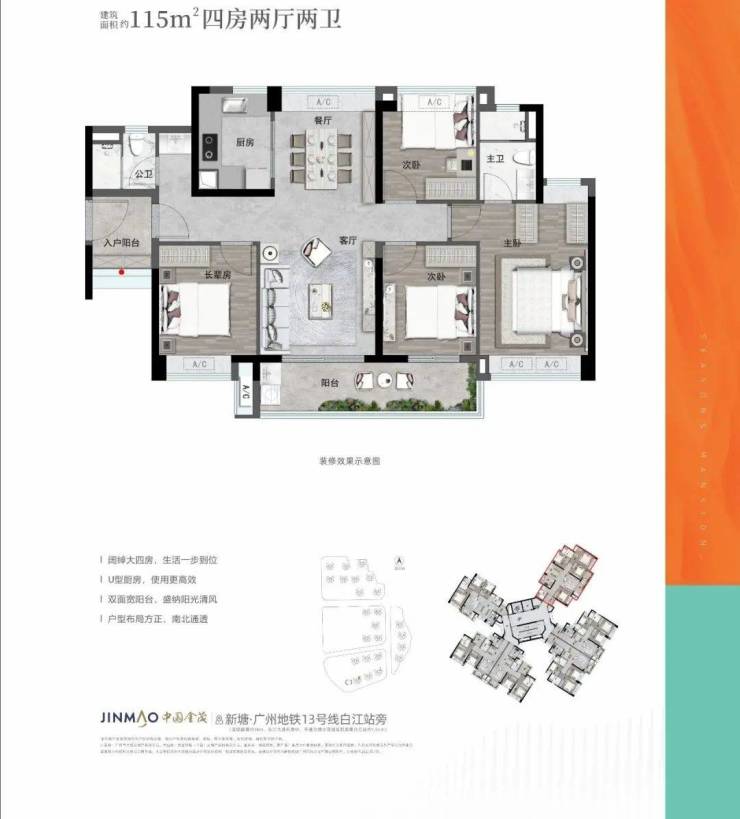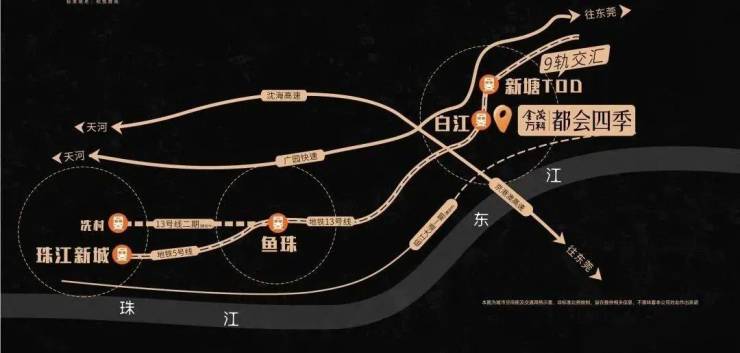 金茂万科都会四季位于广州增城区新塘板块东洲大道(临近地铁白江站(实际距离约1.3km)),项目总体量接近70万㎡,集高端住宅、商业及教育配套为一体,以金茂与万科成熟的城市运营能力,强大品牌号召力,必将再造一座传奇大城!