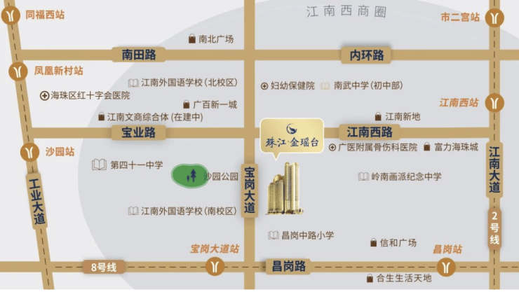 珠江·金瑶台交通便利,地处江南西板块,宝岗大道连接江南大道与工业大道,占据城市三条主干道核心位置。项目距离地铁8号线宝岗大道站约500米,距2号线江南西站约800米,形成高效双轨交通网络,出行便捷,可快速抵达珠江新城、广州南站及周边主要城市枢纽。驾车出行同样便捷,通过宝岗大道与江南大道可轻松通达城市各主要区域,20分钟即可到达珠江新城。周边公交线路密集,为日常通勤提供更多选择。项目位于成熟城区,交通便利性与城市繁华高度契合,让居住者在日常生活中既能享受宁静,也能迅速融入都市节奏,实现出行与归家两不误的理想居住体验。