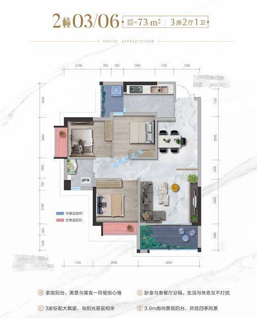 户型设计走高实用性路线。73㎡三房两厅是刚需客户最爱,格局紧凑方正,U型厨房、动静分区合理,超高实用率,赠送面积大。90-111㎡轻奢三房带套间,客厅开阔,主卧独立,阳台赠送多。户型全部南向,南北通透,采光通风优秀,使用率高,飘窗、阳台放大室内尺度,实际居住感超出预期。客厅通透大气,阳台视野开阔,日常做饭、聚会、带娃都特别舒服。