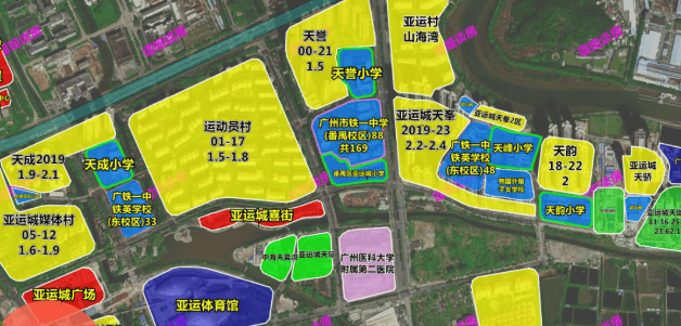 整个板块内设有19所学校,已经开学招生的有18所,包括9所幼儿园、5所小学、3所初中、1所高中以及一所韩国学校。其中,4所省一级广铁一中已全部开学,三所铁一系初中只对口亚运城小区的生源,人户一致优先。天际组团内规划了一所幼儿园和小学,大概率读亚运城小学,小学可插班。初中则需分配,大概率是铁一中学。