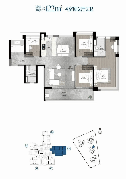 120平方米四房两卫:南北通透,客餐厅联动厨房、阳台、次卧,形成LDKB一体化大空间,主卧配备步入式衣帽间和270°观景窗。